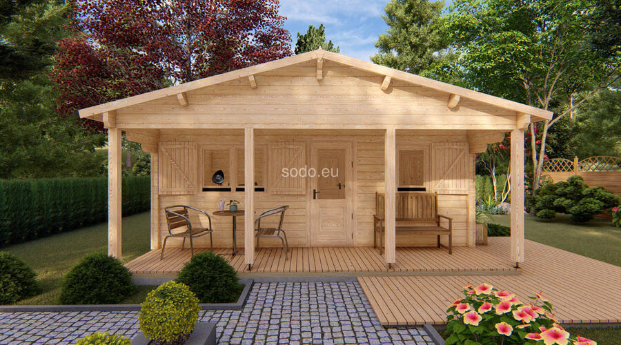 Diese 32,2 m² große Hütte vereint Symmetrie und Schlichtheit und wurde mit 44 mm dicken Wänden und 19 mm starken Dielen gebaut. Mit ihrem Satteldach und ihrer klaren Raumaufteilung eignet sie sich ideal als saisonale Unterkunft, Atelier oder Gästehaus.