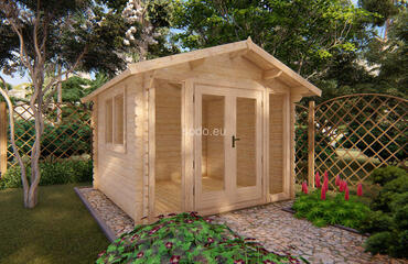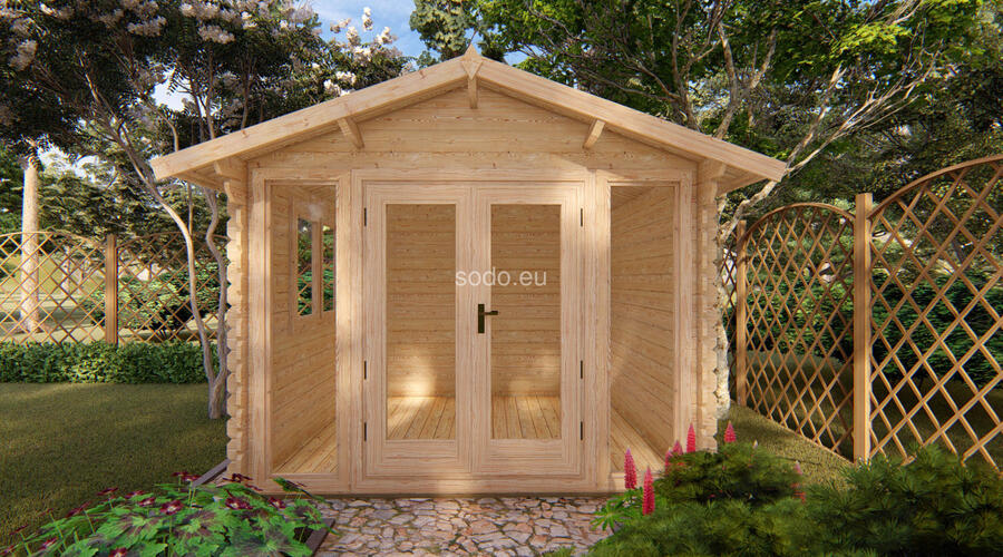 Diese Kabine mit Satteldach verfügt über 44 mm dicke Wände und 19 mm dicke Dielen und bietet 7,5 m² Innenraum. Ihr Grundriss eignet sich für einen kleinen Rückzugsort oder ein Gartenbüro.