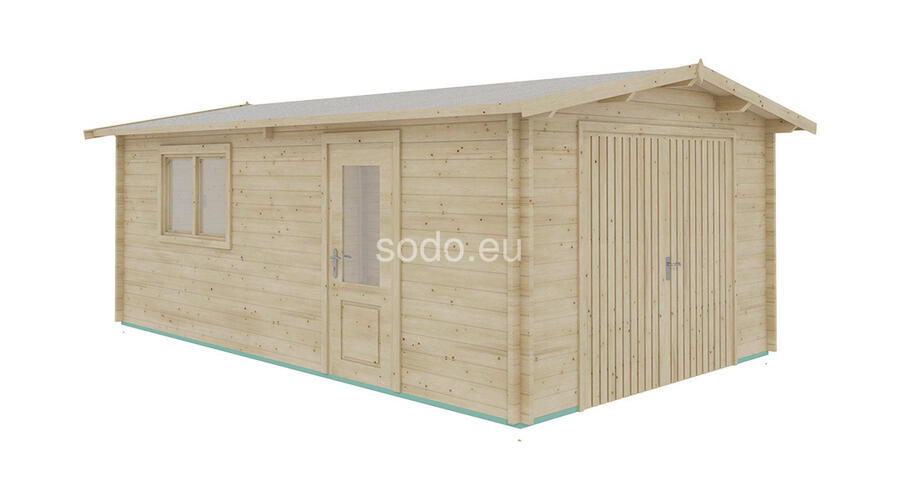 Garage 21,2 m² Innenfläche unter einem Satteldach, gebaut mit 44 mm Wänden, geeignet für mittelgroße Fahrzeuge oder als Werkstatt.