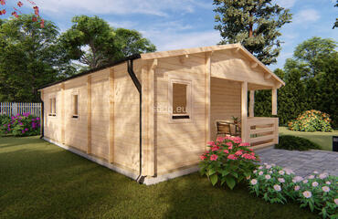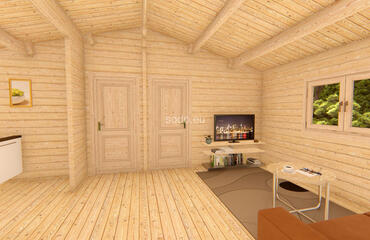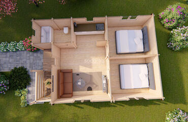 Diese elegante Hütte hat eine Fläche von 41,8 m² und verfügt über 58 mm dicke Wände und 19 mm dicke Dielen. Mit ihrem Satteldach und den großzügigen Fensterflächen eignet sie sich ideal als ganzjähriges Wohnhaus oder großes Atelier.