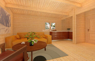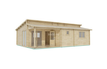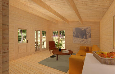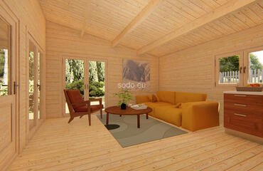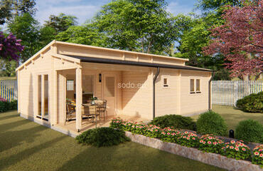 Eine geräumige 44,4 m² große Hütte mit Giebeldach im Iberica-Stil, 58 mm starken Wänden und 19 mm starken Dielen. Entworfen für eine elegante Wohnnutzung mit mehreren Räumen.