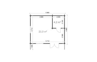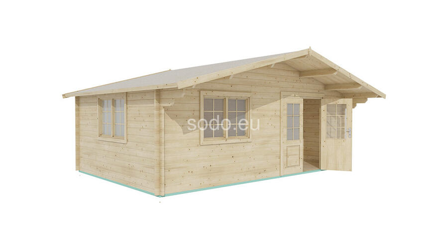 A gable-roofed cabin with 44mm walls and 19mm floorboards, providing 26.7 m² of internal space. Economy glazing and a built-in WC room make it a practical solution for extended garden use or seasonal accommodation.