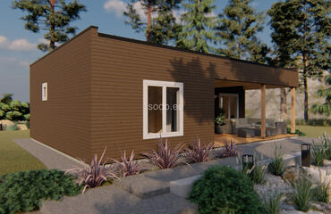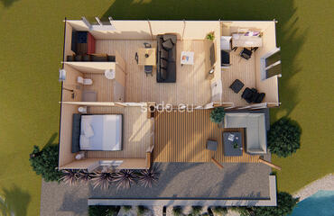 Arica biedt 47,4 m² ruimte onder een zadeldak, gebouwd met 44 mm dikke wanden en 28 mm dikke vloerdelen. Dankzij de volledig glazen deuren en de moderne indeling is deze woning perfect voor stijlvol tuinleven.