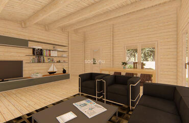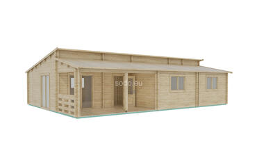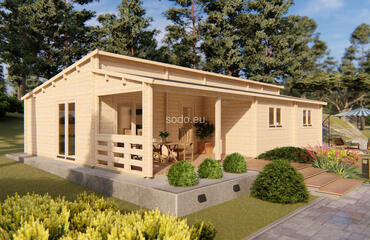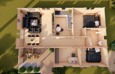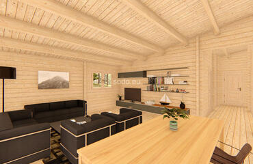 Dit huis is gebouwd met het oog op comfort en heeft muren van 58 mm, vloerdelen van 19 mm en een zadeldak met een hoogte van 3,31 m. Het heeft een interne oppervlakte van 73,8 m² plus een terras van 11 m², met 3 slaapkamers, een aparte keuken en een ruime woonkamer.