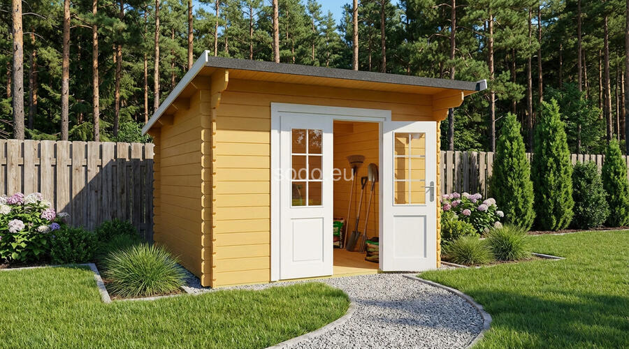 Esta cabaña tipo cobertizo tiene paredes de 28 mm y un espacio interior de 7,5 m². Las tablas del suelo, de 19 mm, garantizan su durabilidad para un uso residencial ligero o como cuarto de servicio. Camión completo: 24 unidades. Tamaño del paquete: (550 x 3800 x 1200)