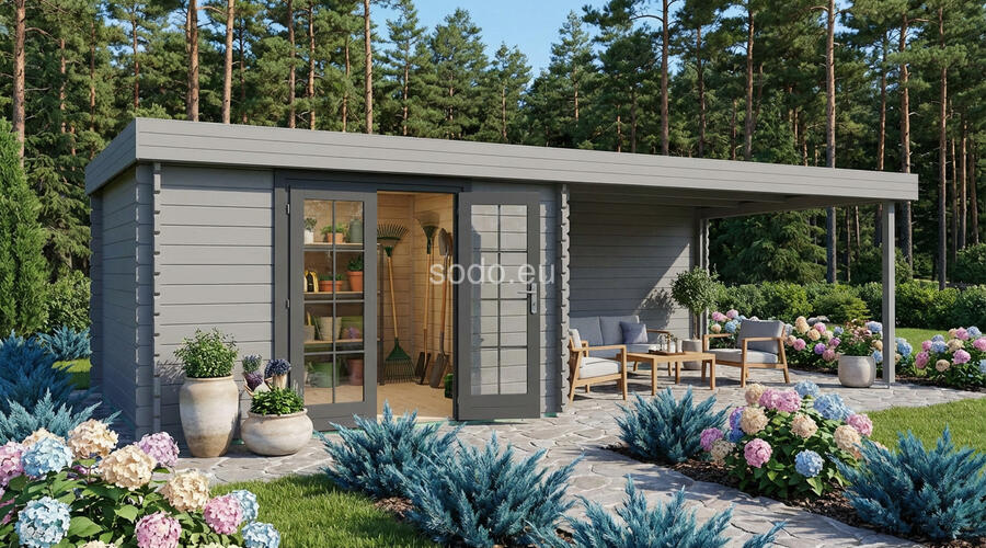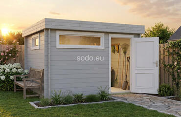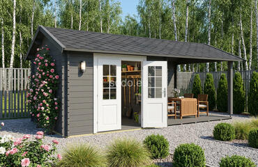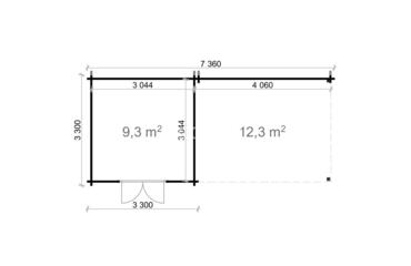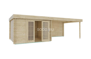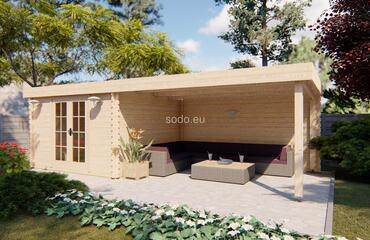 Esta cabaña tiene paredes de 28 mm y tablas de suelo de 19 mm, lo que ofrece un espacio interior de 9,3 m². Su diseño alargado se adapta a usos multifuncionales, como estudio o habitación de invitados. Camión completo: 18 unidades. Tamaño del paquete: (800 x 4300 x 1200)