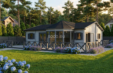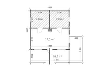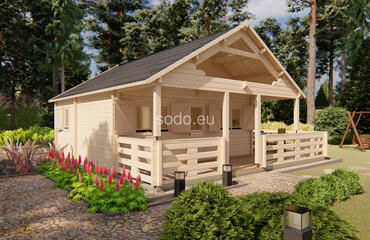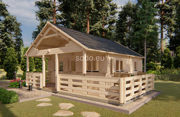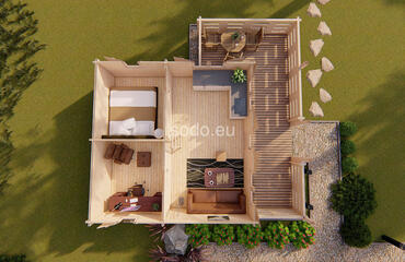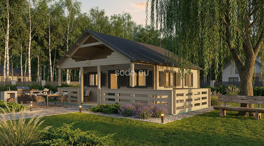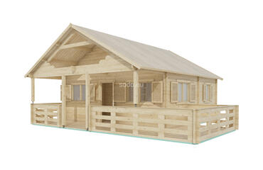 Combina 32 m² de espacio interior con un altillo de 14 m² y una terraza de 19 m², construido con paredes de 68 mm y tablas de suelo de 28 mm. El techo a dos aguas alcanza los 4,12 m, con una distribución adecuada para familias pequeñas o para uso durante los fines de semana.