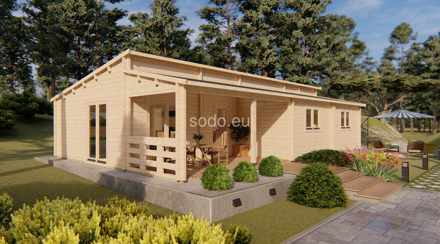 Diseñada para ofrecer comodidad, esta casa cuenta con paredes de 68 mm, suelos de 28 mm y un tejado a dos aguas con una altura máxima de 3,31 m. Incluye 73,8 m² de espacio interior más una terraza de 11 m², con 3 dormitorios, una cocina independiente y un amplio salón.