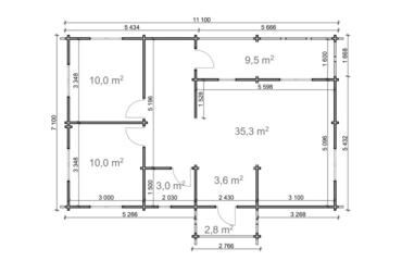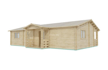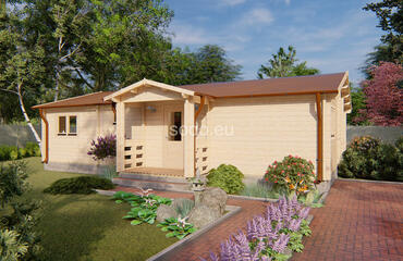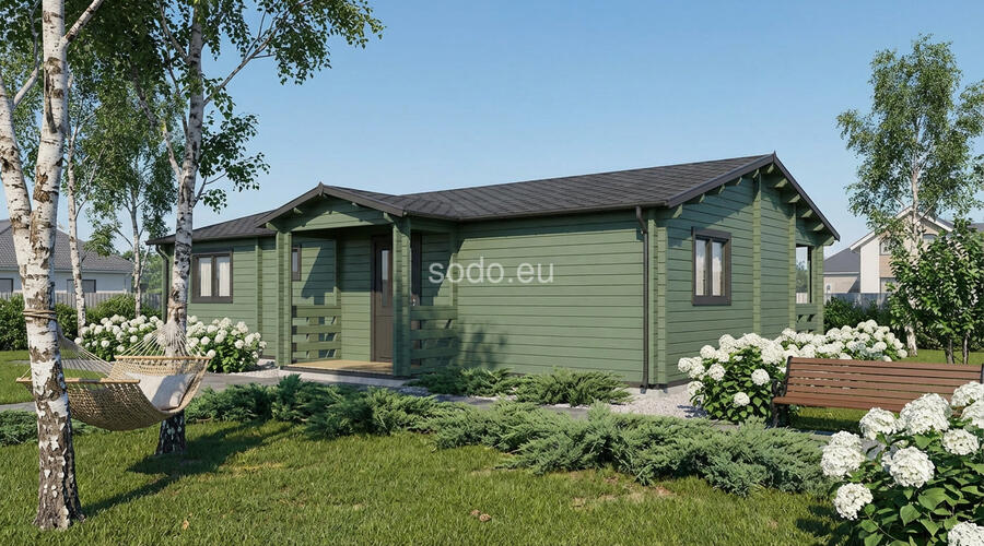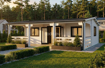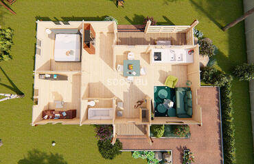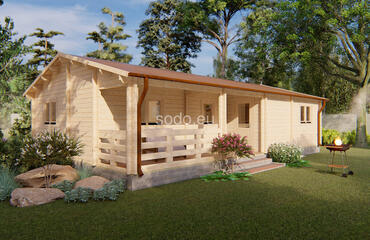 Markus combina 62,1 m² de espacio interior con una terraza cubierta de 12,3 m², construida con paredes de 68 mm, tablas de suelo de 28 mm y un techo a dos aguas de 3,24 m de altura. La distribución incluye 2 dormitorios, una amplia zona de estar y un cuarto de baño, ideal para su uso durante todo el año.