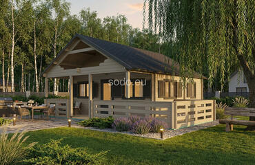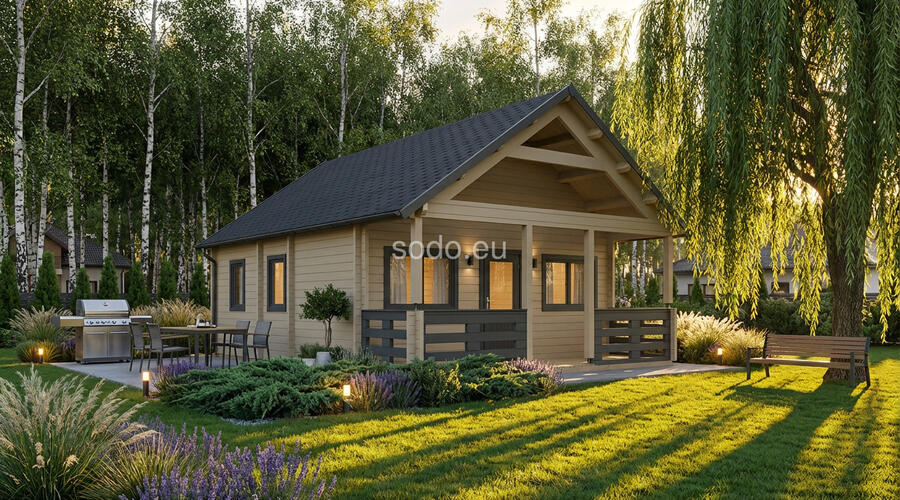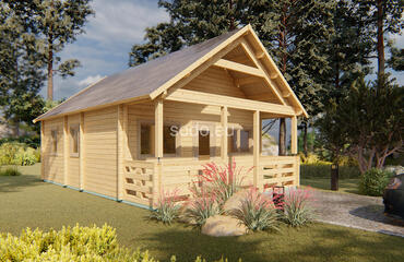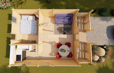 Max ofrece 32,4 m² de espacio interior con paredes de 68 mm y tablas de suelo de 28 mm. Su techo a dos aguas y su diseño abierto lo convierten en una opción versátil para estudios o casas de huéspedes.