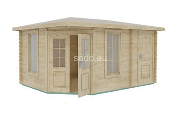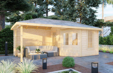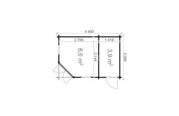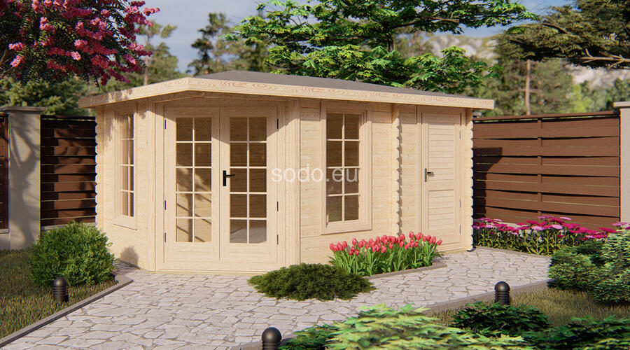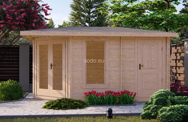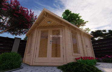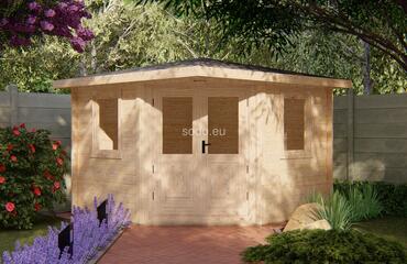 Cabaña con techo a cuatro aguas, paredes de 28 mm y suelos de 19 mm, con una superficie de 10,8 m². La distribución en dos habitaciones permite un uso multifuncional en el jardín. Camión completo: 12 unidades. Tamaño del paquete: (750 x 4700 x 1200)