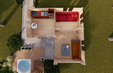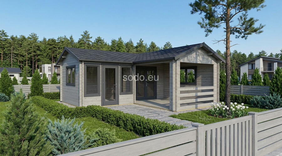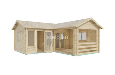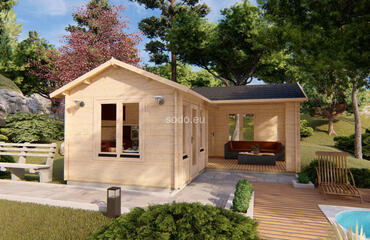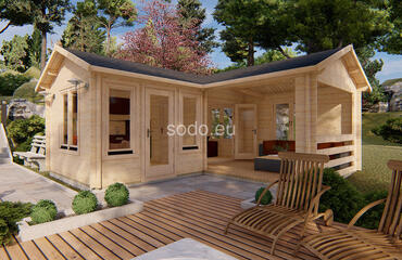 Cabaña premium con techo a dos aguas, paredes de 44 mm y suelos de 19 mm, con una superficie de 14,2 m². Las ventanas de doble acristalamiento y la amplia distribución permiten su uso durante todo el año. Camión completo: 6 unidades. Tamaño del paquete: (880 x 6000 x 1200), (300 x 3000 x 1200), (ST800 x 2200 x 1800)