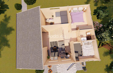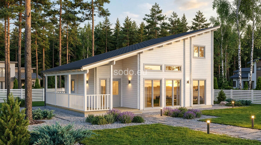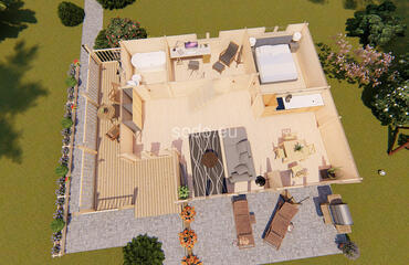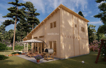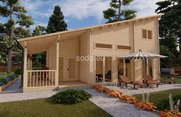 Salvador tiene una superficie de 95,6 m² y cuenta con una distribución en dos niveles con paredes de 68 mm y suelos de 28 mm. Ideal para vivir a tiempo completo o como alojamiento de lujo con jardín.