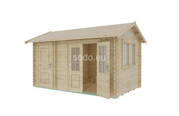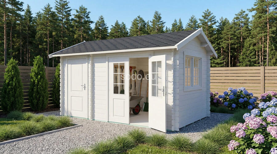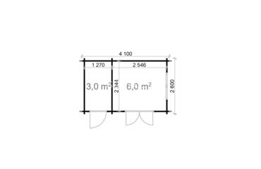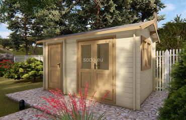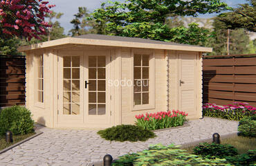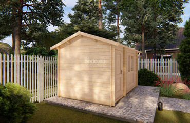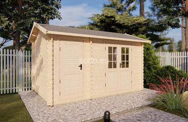 El techo a dos aguas y las paredes de 28 mm encierran un espacio interior de 9,0 m². Las tablas del suelo de 19 mm permiten utilizarlo como estudio o habitación de invitados. Camión completo: 24 unidades. Tamaño del paquete: (600 x 4300 x 1200)