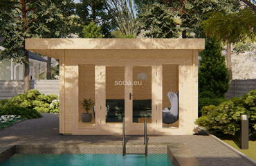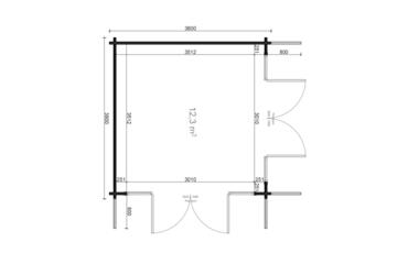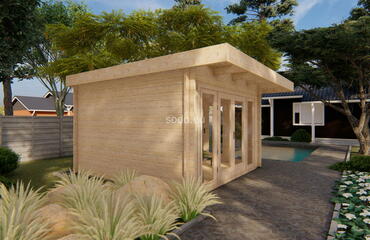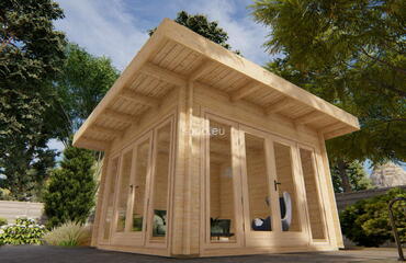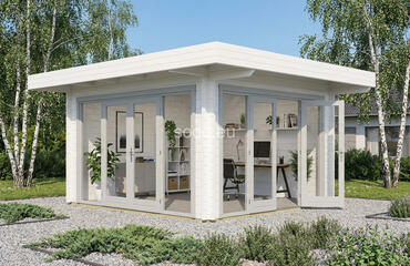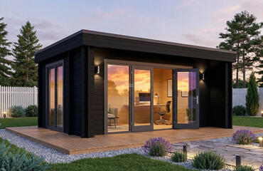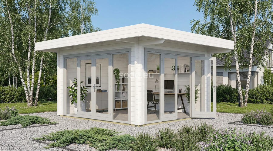 Sydney ofrece 12,3 m² de espacio interior bajo un techo a dos aguas, construido con paredes de 44 mm y tablas de suelo de 19 mm. Su diseño simétrico y sus grandes ventanas lo convierten en una opción elegante para una oficina compacta.