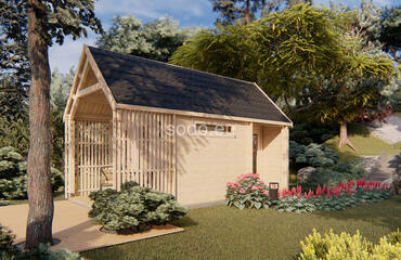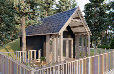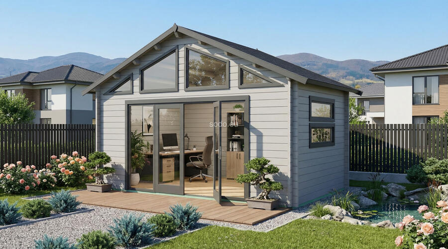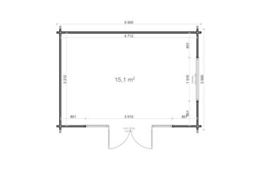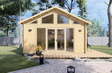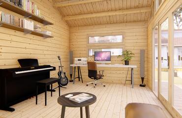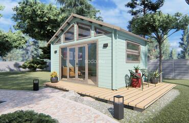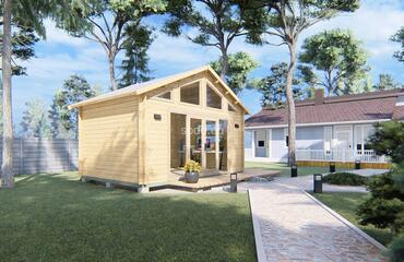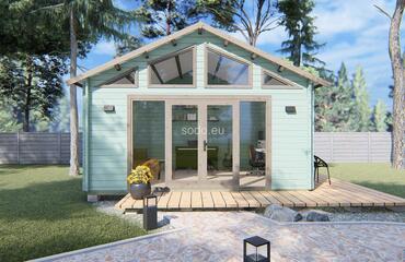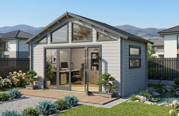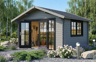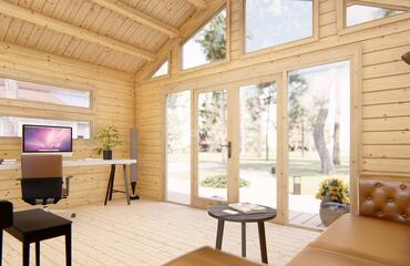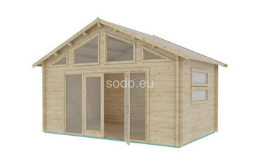 Esta cabaña con techo a dos aguas tiene una superficie de 15,1 m² y cuenta con paredes de 44 mm y tablas de suelo de 19 mm. Con puertas totalmente acristaladas y un interior luminoso, es ideal para un estudio o un espacio de trabajo. Camión completo: 12 unidades. Tamaño del paquete: (880 x 5000 x 1200), (300 x 2700 x 1200)