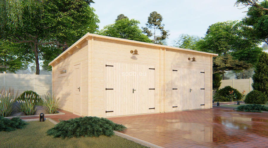Este garaje económico ofrece 34,8 m² de espacio interior, construido con paredes duraderas de 44 mm de grosor y un clásico techo a dos aguas. Con una altura de cumbrera de 2,83 m, es una solución práctica y espaciosa para el almacenamiento diario de vehículos o para uso como taller.