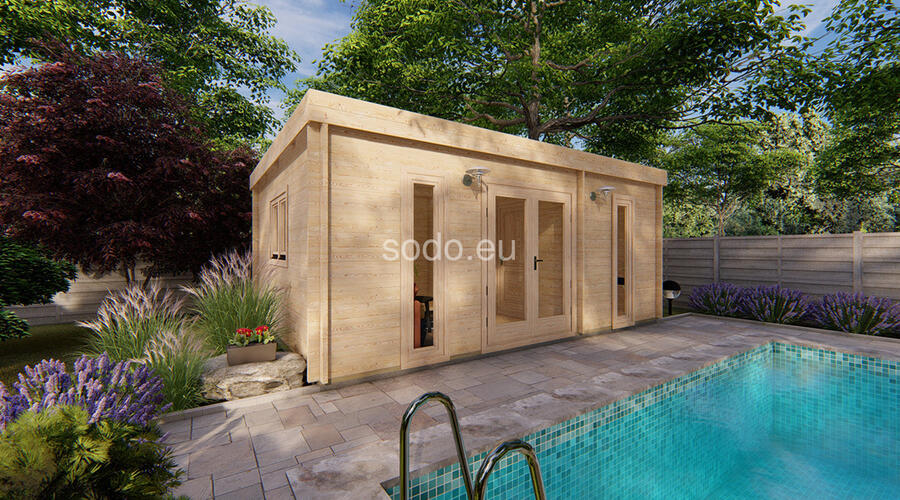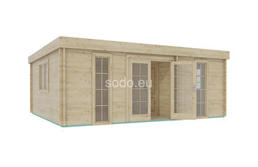 Una cabaña con techo plano, paredes de 44 mm y suelos de 19 mm, que ofrece 23,8 m² de espacio interior. Su acristalamiento económico y sus cuatro ventanas la convierten en una opción práctica para uso estacional, espacios de trabajo creativos o jardines compactos.