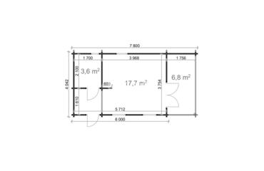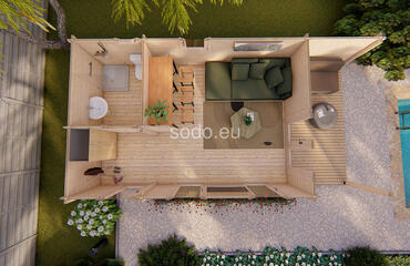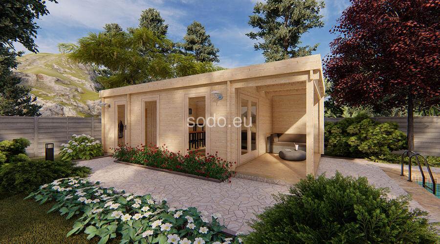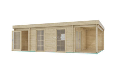 Versión económica con paredes de 44 mm y techo plano, con una superficie de 21,3 m². Construida con tablas de suelo de 19 mm y acristalamiento básico para uso estacional.