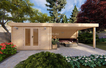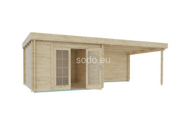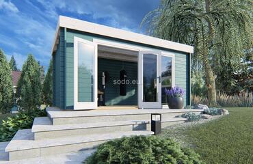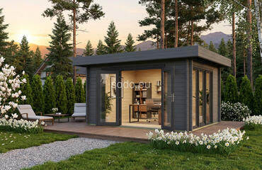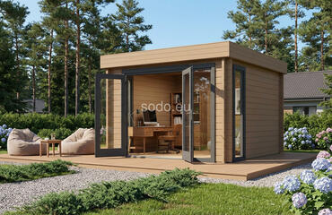 Una cabaña con techo plano, paredes de 44 mm y suelos de 19 mm, que ofrece 9,1 m² de espacio interior. Su acristalamiento económico y su diseño aerodinámico se adaptan a un espacio de trabajo minimalista o a un refugio.