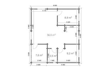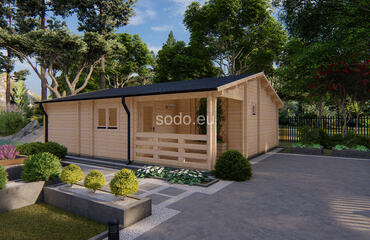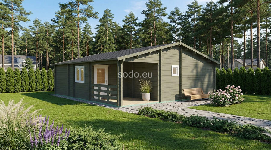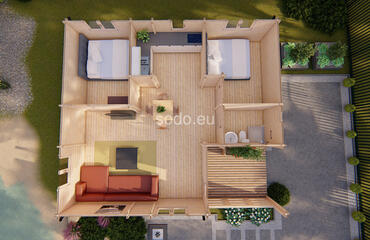 Construida con paredes de 68 mm, suelos de 28 mm y un tejado a dos aguas de 3,31 m, Orlando ofrece 57,6 m² de espacio interior y una terraza de 7,6 m². Incluye 2 dormitorios, una sala de estar y un cuarto de baño, ideal para familias pequeñas o para alojar invitados.