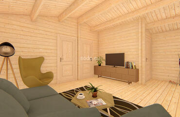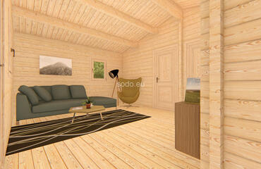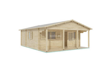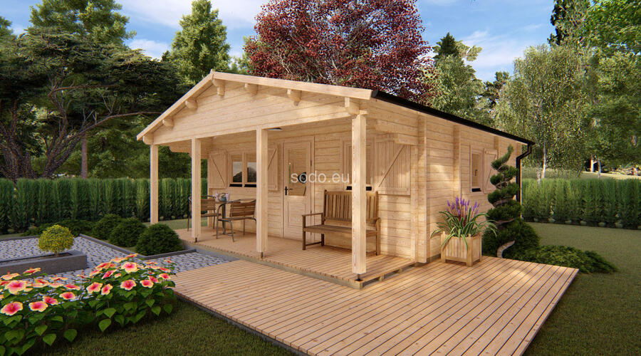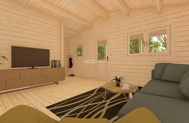 Este modelo económico ofrece 32 m² de espacio interior con paredes de 58 mm, suelos de 19 mm y un tejado a dos aguas de 2,97 m de altura. Incluye 2 dormitorios, una sala de estar y un aseo, ideal para uso estacional o para una vida compacta.