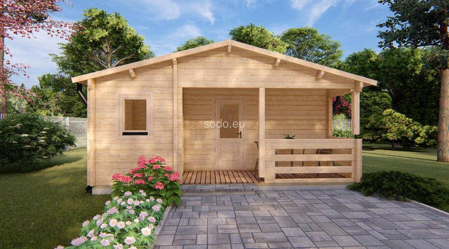 This elegant chalet spans 41.8 m² and features 68mm walls and 28mm floor boards. With a gable roof and generous glazing, it’s designed for full-time living or large studio use.