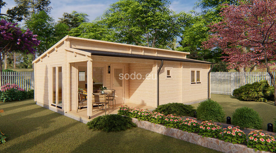 Designed with 68 mm spruce walls and 28 mm floor boards, this model offers 44.4 m² of internal space and a 6.1 m² terrace. A gable roof rising to 3.1 m shelters a layout with 2 bedrooms, a kitchen, and living area—ideal for compact family living.
