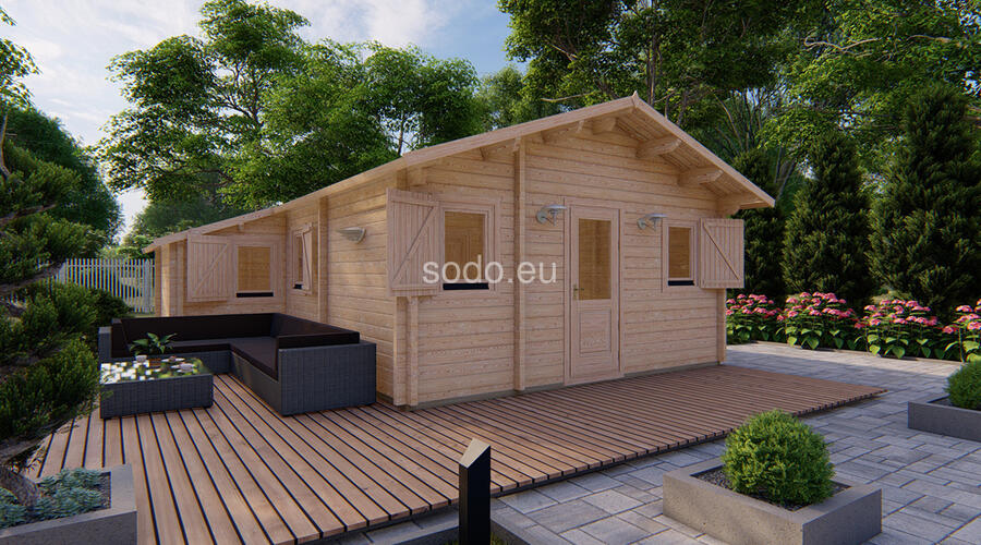 Compact yet functional, Lukas offers 37.8 m² of internal space with 68 mm walls, 28 mm floor boards, and a gable roof height of 3.11 m. Includes 2 bedrooms, a combined living/kitchen area, and a bathroom.
