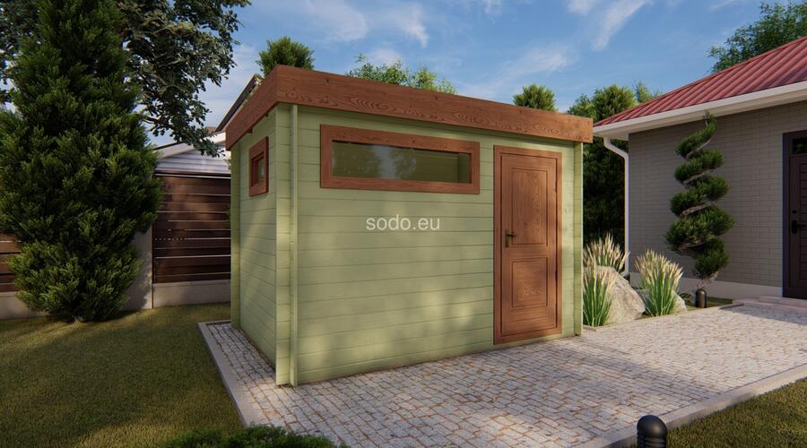 Flat roof and 28mm walls enclose 6.7 m² of internal space. Built with 19mm floor boards for seasonal use.
