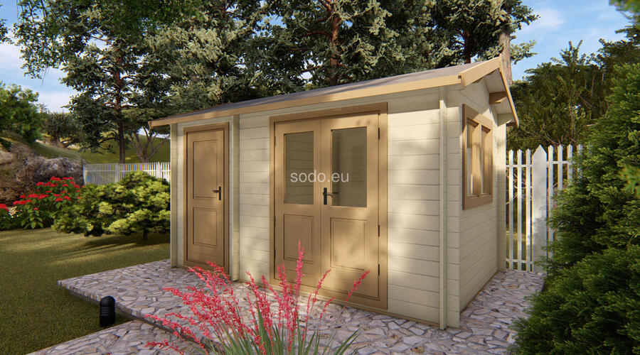 Gable roof and 28mm walls enclose 9.0 m² of internal space. 19mm floor boards support studio or guest room use.