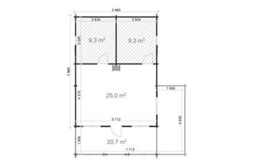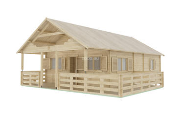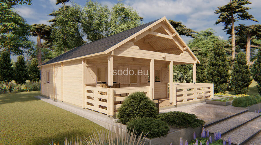 Spanning 43.6 m², this gable-roofed cabin includes 44mm walls and 19mm floor boards. Its layout supports multi-room use for living or studio purposes.