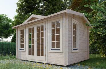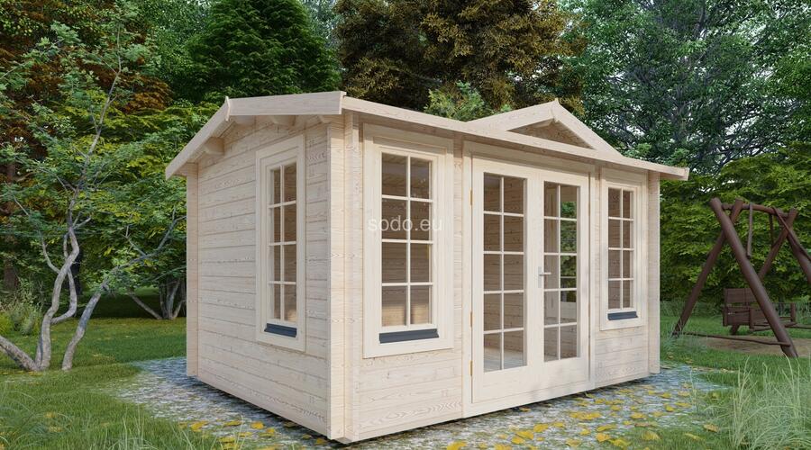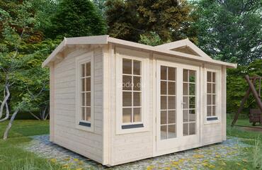 Inspired by clockhouse architecture, Kairo 4×3 features a central peaked gable roof and symmetrical windows. With 44 mm walls, 19 mm floor boards, and 12 m² of internal space, it’s a visually striking option for a garden studio or reading room.