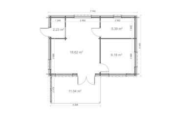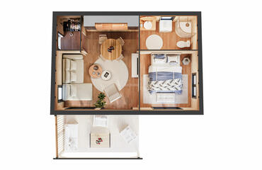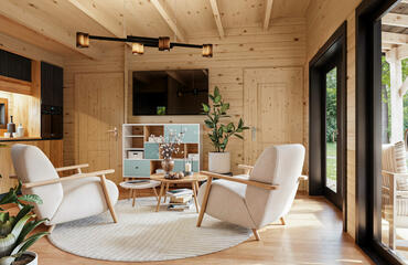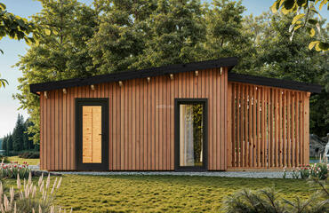 The Verno model blends Scandinavian style with smart functionality. It features a fully insulated structure, vertical wood cladding, and a gently sloped roof. Inside, you'll find a bright living area, a separate bedroom, a bathroom and access to a covered outdoor terrace.