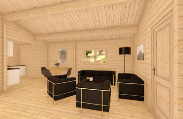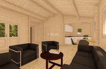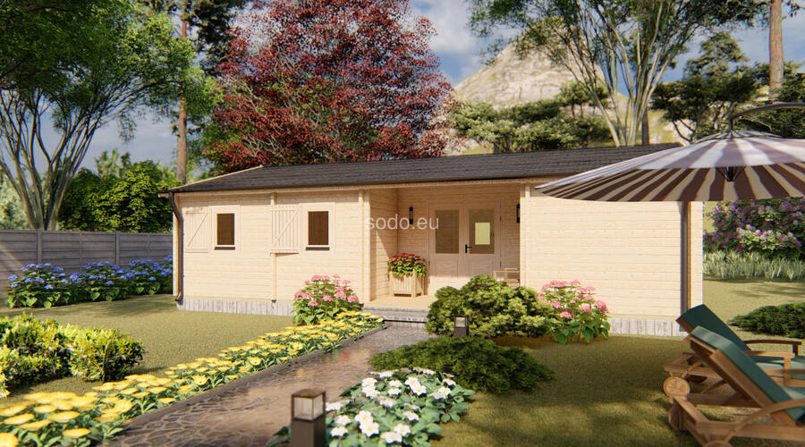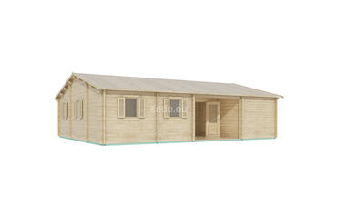 Scarlett provides 59 m² of internal space with 58 mm walls, 19 mm floor boards, and a gable roof peaking at 3.24 m. The layout includes 3 bedrooms, a living area, and a bathroom—versatile and family-friendly.