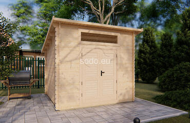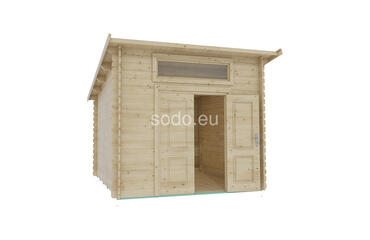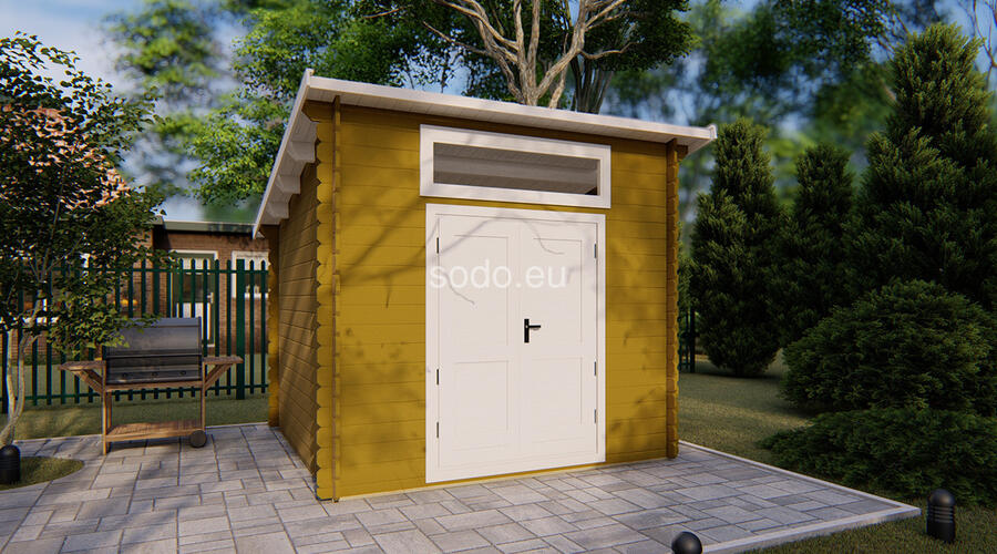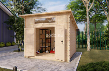 Abri de jardin construit avec des murs en épicéa de 44 mm d'épaisseur et un plancher de 19 mm, offrant un espace intérieur de 7,5 m². Son agencement en pièce unique, ses doubles portes et sa grande fenêtre verticale en font un espace idéal pour une utilisation saisonnière, un rangement compact ou un refuge minimaliste dans votre jardin.