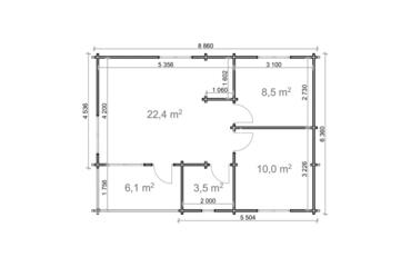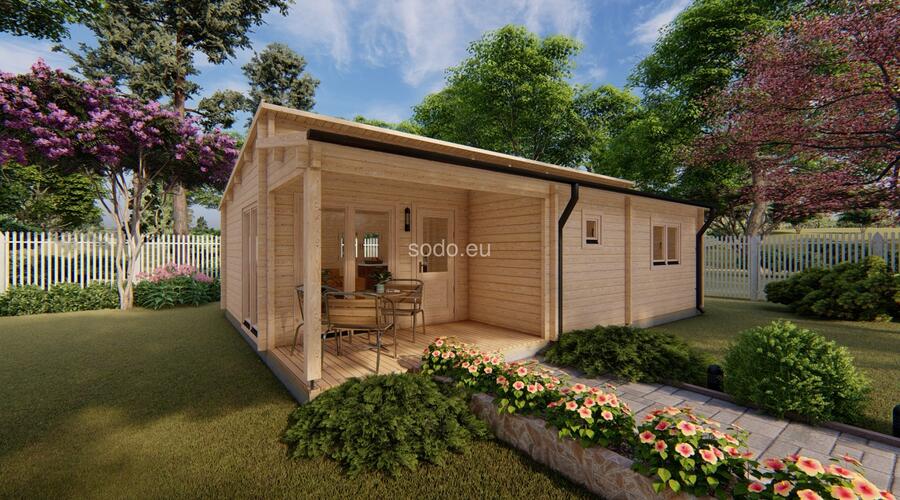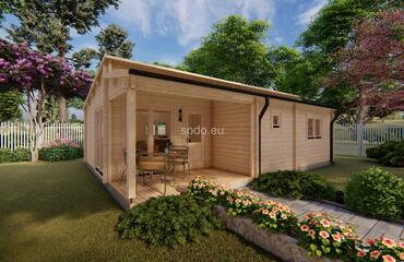 Une Iberica spacieuse avec toit à pignon, murs de 44 mm et plancher de 28 mm. Conçue pour un usage résidentiel élégant avec plusieurs pièces.