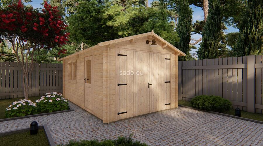 Kompaktiškas garažas su dvišlaičiu stogu, 28 mm sienomis ir 19 mm grindų lentomis. Jame yra 1 kambarys ir 19,9 m² stogo plotas – puikiai tinka vienam automobiliui laikyti.