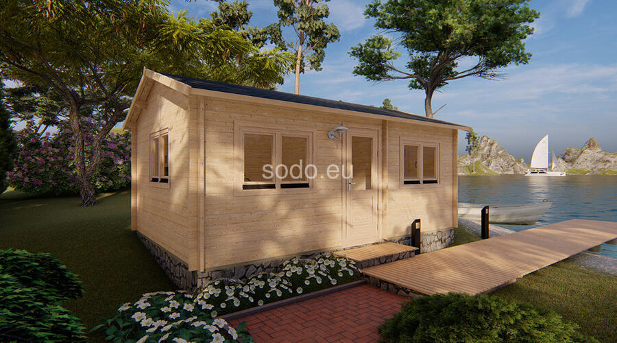 A gable-roofed cabin with 44mm walls and 19mm floorboards, providing 21.1 m² of internal space. Economy glazing and four windows make it a practical choice for seasonal use, creative workspaces, or compact garden living.