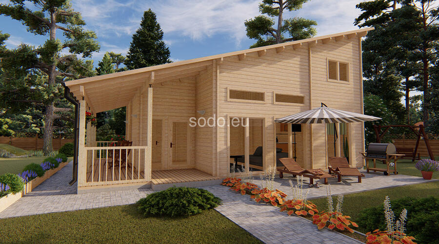 Salvador spans 95.6 m² and features a two-level layout with 68mm walls and 28mm floor boards. Ideal for full-time living or upscale garden accommodation.