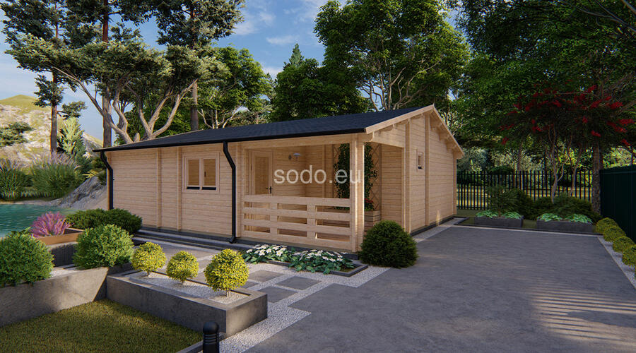 Built with 68 mm walls, 28 mm floor boards, and a gable roof reaching 3.31 m, Orlando offers 57.6 m² of internal space and a 7.6 m² terrace. Includes 2 bedrooms, a living room, and a bathroom—perfect for small families or guest stays.