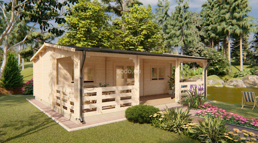 Alma is a spacious summerhouse with 68 mm walls and 19 mm floor boards, offering 32.1 m² of internal space. Its gable roof and multi-room layout make it suitable for residential or recreational use.