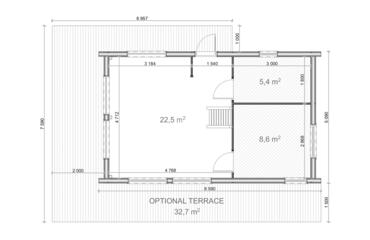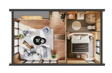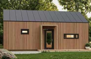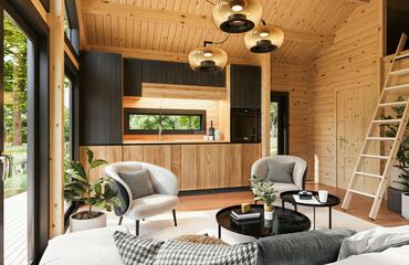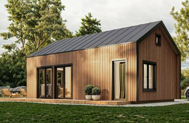 This stylish wooden house features a bright open-plan layout, a separate bedroom, big 5,4 m2 bathroom, a cozy loft space, and striking trapezoid windows that enhance natural light and modern character. With its high gabled roof, vertical cladding, and full insulation, it offers both charm and year-round comfort in a compact, efficient design.