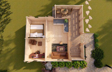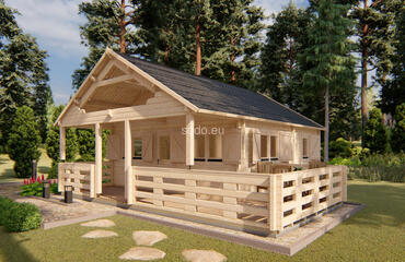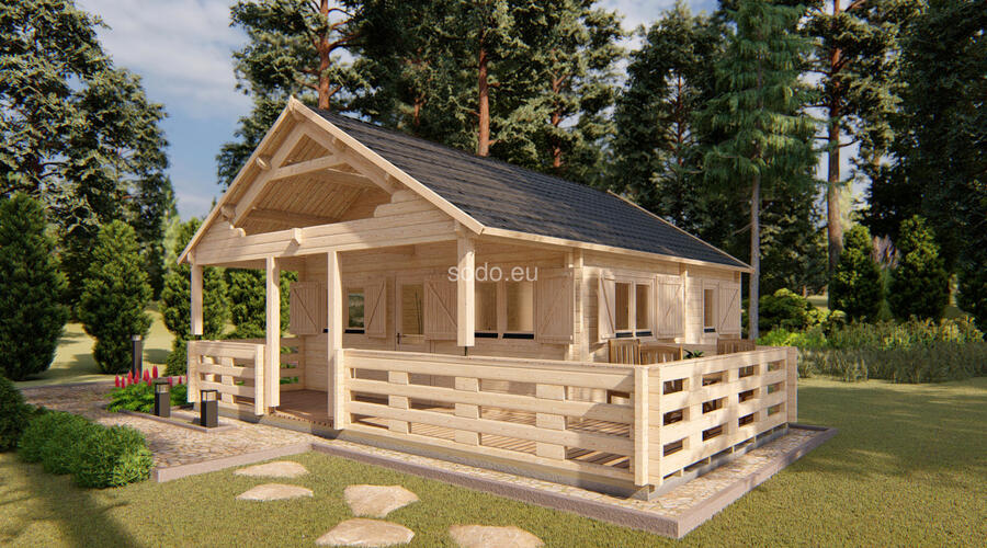 This 31.5 m² cabin includes 58 mm walls and 19mm floor boards, with a gable roof and multiple rooms. Ideal for seasonal or year-round living.