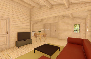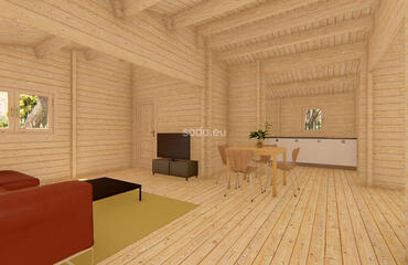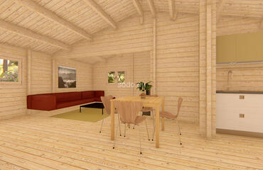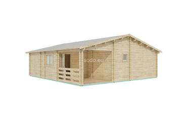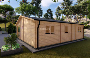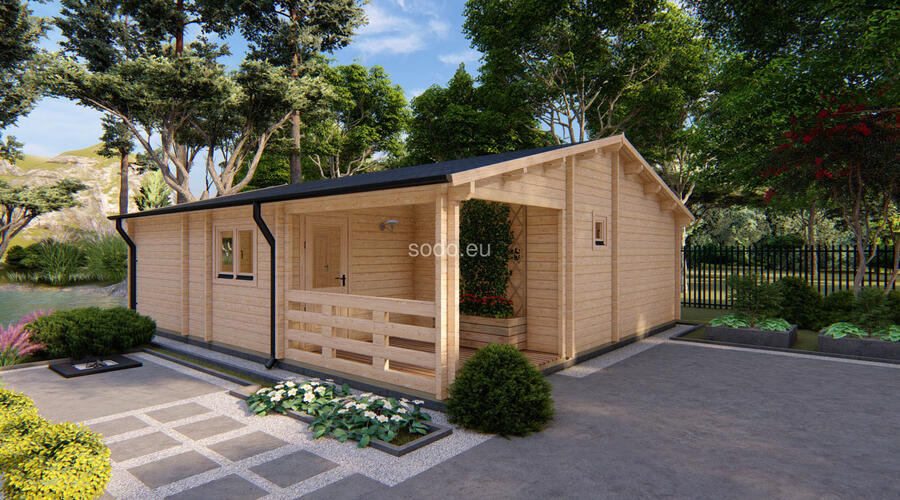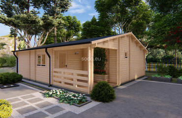 Built with 58 mm walls, 19 mm floor boards, and a gable roof reaching 3.31 m, Orlando offers 57.6 m² of internal space and a 7.6 m² terrace. Includes 2 bedrooms, a living room, and a bathroom—perfect for small families or guest stays.