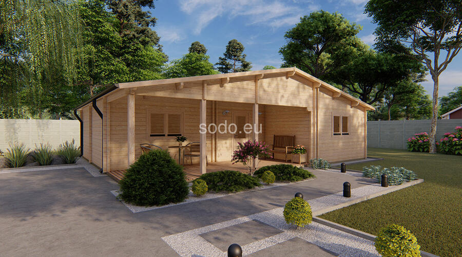 Jennifer oferuje 65,4 m² powierzchni wewnętrznej ze ścianami o grubości 68 mm i deskami podłogowymi o grubości 28 mm. Dwuspadowy dach i duże przeszklenia sprawiają, że idealnie nadaje się na luksusowy domek letniskowy.
