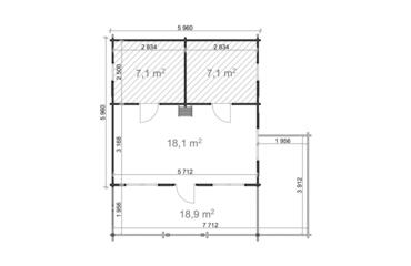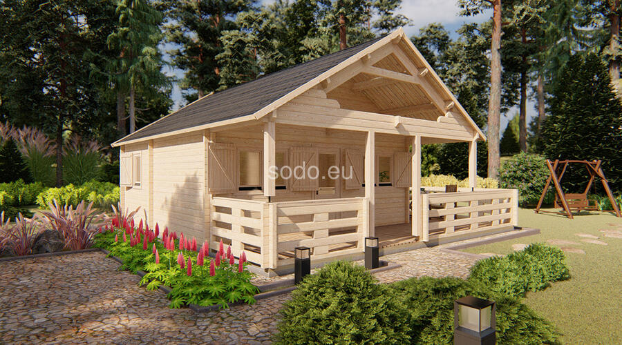 Ta kabina o powierzchni 31,5 m² ma ściany o grubości 44 mm i deski podłogowe o grubości 19 mm, dach dwuspadowy i wiele pomieszczeń. Idealna do zamieszkania sezonowego lub całorocznego.