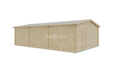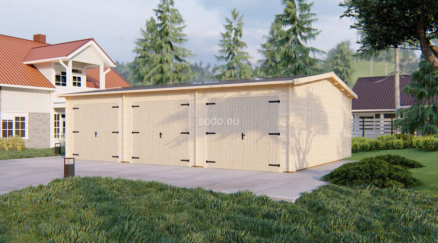 Ten ekonomiczny garaż oferuje 49,8 m² powierzchni wewnętrznej z dwuspadowym dachem i ścianami o grubości 44 mm. Wysokość kalenicy wynosi 2,9 m, co sprawia, że jest to proste rozwiązanie do parkowania lub wykorzystania jako warsztat bez nadmiernej objętości.