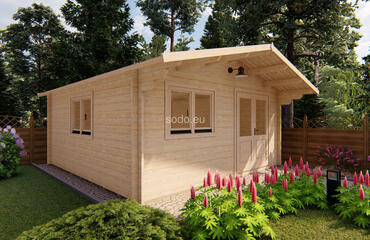 A gable-roofed cabin with 44mm walls and 19mm floorboards, providing 22.2 m² of internal space. Its economy glazing and single-room layout make it a versatile choice for seasonal living or creative workspaces.