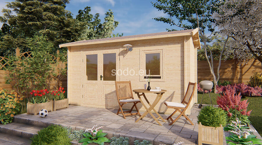Domek z dwuspadowym dachem, ścianami o grubości 44 mm i podłogą z desek o grubości 19 mm oferuje 6,9 m² powierzchni wewnętrznej. Podwójne szyby i układ jednopokojowy sprawiają, że jest to przytulne miejsce na wypoczynek w ogrodzie.